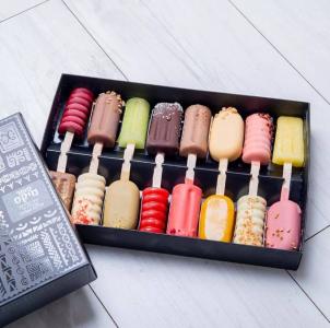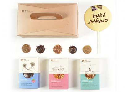 שוקולדים ברמה גבוהה, כולל שוקולד גדול על מקל בצורת לב עם הקדשה אישית.